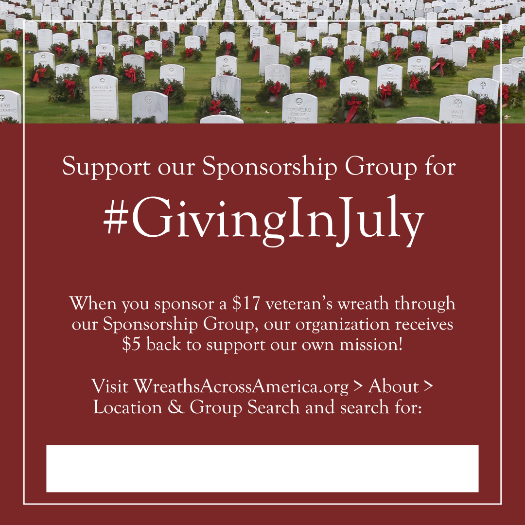 • $5 Back Groups: Do good twice! When you sponsor a veteran’s wreath through our Sponsorship Group, we honor a local hero and receive $5 to support our mission! Help us reach our goals during Giving in July! To support our group, visit:(Insert Group Sponsorship Link)