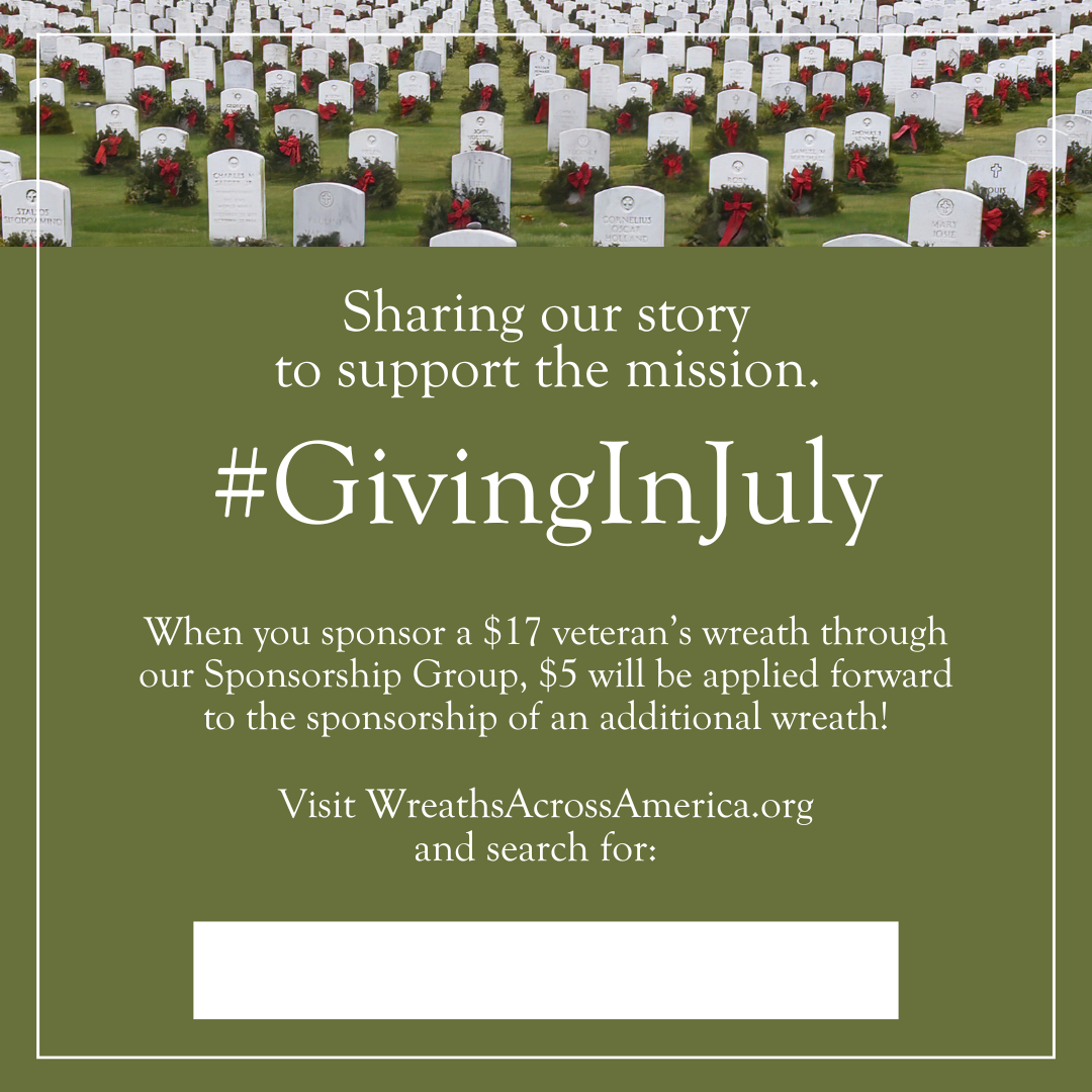 • Download our Giving In July graphics, share them on social media with the hashtag #GivingInJuly, and include a direct link to your Group’s Sponsorship page! Use your post to share what makes your Sponsorship Group unique and why people should support you during Giving in July. Tell your story! And don’t forget to tag Wreaths Across America for a chance to have your story shared on our Official Facebook page!
