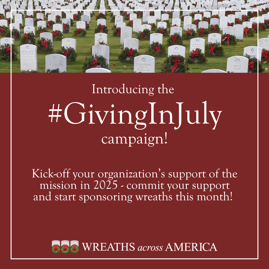 • Give Your Time! Giving in July isn’t just about sponsorships. The gift of time can sometimes make an even bigger impact on lives and communities. If you support the mission year-round, we invite you to share that effort with us! Post today on social media and tag Wreaths Across America so we can see it and share. Also, use the hashtag #GivingInJuly.